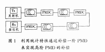 (1) 通過分布式補償一階PMD來抑制高階PMD.該技術由朗訊公司在ECOC2002上提出[3].由于各階PMD的統計特性有著內在的聯系,利用這種內在的聯系,通過分布式補償一階PMD,就可以抑制高階PMD.對于二階PMD而言,它的DGD的均方值與一階PMD之間滿足