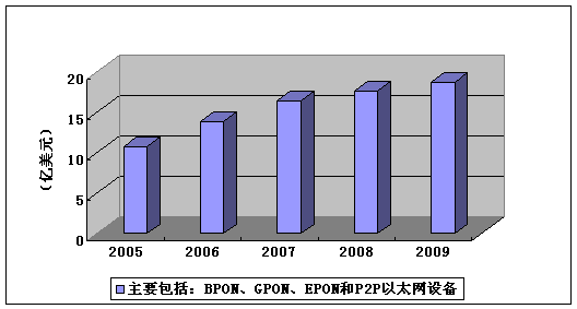 預計未來幾年,全球的光纖接入市場將迅速增長,到2009年全球光纖接入設備的收入將達到19億美元,采用的技術主要包括BPON、EPON、GPON以及P2P 等。從2005到2009年,全球光纖接入市場的年復合增長率將達到16.6%,如圖1所示。而視頻業務將是全球光纖接入發展的主要驅動力。