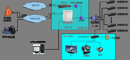 對于CATV業(yè)務(wù)來說,可采用烽火通信一纖三波WDM方式來承載。在單纖方案中,AN5116利用1550nm波長透明承載CATV業(yè)務(wù),具體的信號格式可以是CATV,也可以是DTV/HDTV等。當(dāng)廣電部門提供的視頻信號源為數(shù)字信號時,只需在模擬TV接入方案的基礎(chǔ)上在每個用戶家中再安裝一個機(jī)頂盒或直接將家庭ONU更換為具有光電轉(zhuǎn)換和編解碼功能的機(jī)頂盒,用于將接收到的數(shù)字信號進(jìn)行解碼,還原為普通電視機(jī)可以識別的信號。