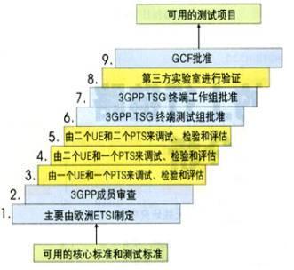 一致性測試項目的開發(fā)程序如圖2所示。由歐洲ETSI制定出可用的相關(guān)核心標準和測試標準之后,經(jīng)過不同數(shù)量的WCDMA終端和測試系統(tǒng)進行多次檢驗和驗證,再提交3GPP的終端工作組進行審批。在審批合格后,測試項目由第三方測試實驗室在相應(yīng)的測試系統(tǒng)上進行驗證和認證,再經(jīng)GCF和PTCRB批準,才能成為GCF和PTCRB認可認證的一致性測試項目。