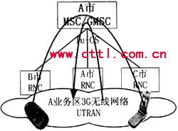 此時要求本地電話端局能夠通過前三位的網號識別出被叫為本公司的3G用戶,并將所有這類呼叫轉接至所連接的匯接局,本地匯接局將接收到的所有被叫為本公司3G用聲的呼叫轉至它所連接的MSC/GMSC設備(發端入網)。由這個MSC/GMSC設備進行下一步的路由,并判斷為一次本地通話還是長途通話。這種情形下的話務路由為:主叫固定電話用戶→本地網端局→本地網匯接局→A市MSC/GMSC→A業務區內被叫3G用戶。