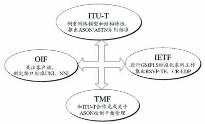 2000年前后,許多國際標準化組織和論壇(如ITU-T、IETF、OIF和TMF等)紛紛著手ASON標準化的研究。截至目前,已有大量的有關ASON的標準草案面世,如ITU-T的G.8080、G.8081和G.771x系列;IETF的GMPLS協議族;OIF的UNI1.0、UNI2.0和ENNI信令和路由等。這些標準化組織的目標是制定一個開放式的通用智能化光網絡模型以及相關的標準接口、自動交換和動態配置控制協議,便于不同廠商的設備在光網絡中互聯互通。ITU-T、IETF和OIF之間工作具有很強的互補性。圖1為ASON標準化組織的不同側重點和相互的關系。