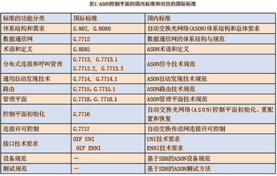 2002年10月,中國通信標準協會傳送網工作組確定啟動我國ASON標準化的制定工作。目前已經立項的標準有《自動交換光網絡(ASON)技術要求》、《自動交換光網絡(ASON)設備技術要求》和《自動交換光網絡(ASON)測試方法》三個系列標準。每個標準都由多個部分組成。其中,在《自動交換光網絡(ASON)技術要求》中又對多個部分分別進行立項,包括結構和總體要求、信令、術語和定義、數據通信網、自動發現、管理平面等。在《自動交換光網絡(ASON)設備技術要求》和《自動交換光網絡(ASON)測試方法》中,對基于SDH的ASON部分分別進行立項。國內有關ASON控制平面標準的計劃及其與國際標準的對應關系見表1。