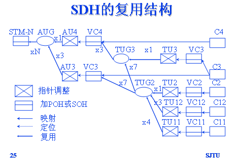 復用: 按單字節間插方法,將N個TU變成TUG,N個AU復接成AUG,N個AUG復用進STM-N的過程