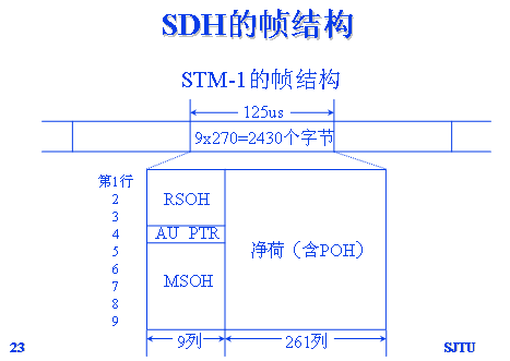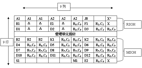 STM-1的基本幀結構,以字節為單位排列,9行x270列為一幀,其中最左面9行x9列為SOH(段開銷)及PTR(Pointer-指針)部分,其余9行x261列為凈負荷(Payoad).