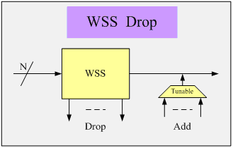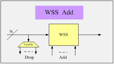 波長選擇交換器(WSS)是近年來發(fā)展迅速的ROADM子系統(tǒng)技術(shù)。WSS基于MEMS光學(xué)平臺,具有頻帶寬、色散低,并且同時支持10/40Gbit/s光信號的特點和內(nèi)在的基于端口的波長定義(Colorless)特性。采用自由空間光交換技術(shù),上下路波數(shù)少,但可以支持更高的維度,集成的部件較多,控制復(fù)雜。基于WSS的ROADM逐漸成為4度以上ROADM的首選技術(shù)。圖3、圖4所示的是波長選擇開關(guān)上下路結(jié)構(gòu)示意圖。