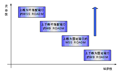 ROADM按功能分類有上下路固定端口的WB ROADM和上路固定端口的WSS ROADM兩種類型。WB ROADM采用固定濾波器分波以及固定上路波長業(yè)務(wù)單板,因省去了高昂的可調(diào)諧濾波器和可調(diào)諧激光器降低了成本,不支持上下路的端口指配功能;WSS ROADM采用固定上路波長業(yè)務(wù)單板,下路端口可實現(xiàn)指配。具體使用過程中應(yīng)根據(jù)市場應(yīng)用的需求靈活選取相應(yīng)類型,低成本的ROADM產(chǎn)品適用于需要波長上下路配置、對端口指配不做要求的市場應(yīng)用領(lǐng)域。