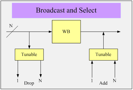 波長阻斷器用阻斷下路波長通過來實現(xiàn)功能,它可以支持較多的光通道數(shù)和較小的通道間隔,具有較低的色散,并可實現(xiàn)多個器件的級聯(lián),易于實現(xiàn)光譜均衡。但波長阻斷器需要額外的上下路模塊來構(gòu)建系統(tǒng),上下路配合可調(diào)濾波器和可調(diào)激光器。從本質(zhì)上講,WB是一個二維器件,通常在構(gòu)建系統(tǒng)中由多個分立器件構(gòu)成,體積較大,但可以支持100GHz和50GHz的波道間隔,并且技術(shù)成熟,成本較低,因此適合用于LH和ULH系統(tǒng)。圖2所示的是廣播/選取結(jié)構(gòu)示意圖。