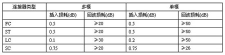 在本文中,我們所說的插入損耗是指由于連接器接口產生的分貝丟失,回波損耗與銅線中的概念一樣,是指由終端反射引起的將能量反射回信號源的情況。連接器插入損耗和回波損耗參數的界定由系統所使用的測試設備決定。盡管各個廠家生產的連接器規格各有不同,但大多數都符合TIA/EIA568B.3商用數據網絡要求。TIA/EIA568B.3規定,多模和單模光纖的最大插入損耗為0.75dB。多模光纖的回波損耗最小≥20dB,單模光纖的回波損耗≥26dBD。SC連接器通常都只有0.3dB的損耗,而LC連接器則可低達0.1dB。