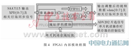 壓縮后數據通過JDATA端口傳輸給FPGA2,將壓縮數據打包和并轉串后,接入數傳通道。為了便于FPGA2接收數據,ADV202主機總線采取JDATA的同步輸出模式。單片機是系統的主控者,完成對ADV202和SAA7115的初始化。對SAA7115的初始化通過I2C總線進行。ADV202的初始化需要片選線、讀寫信號線、4根地址線和16 bit數據線來加載固件和設置寄存器參數。但是單片機是8 bit數據線,而且數據線和地址線復用,所以使用了兩個鎖存器74HC573來實現16 bit數據的讀寫。鎖存器的讀使能信號和ADV202的片選信號由單片機的高位地址線輸入到FPGA1內部譯碼組合后輸出。FPGA1主要完成像素抽取、視頻數據結構調整和輸出ADV202的控制信號,內部模塊如圖4所示。利用FPGA內部的塊RAM,生成2個FIFO,乒乓處理數據,從而達到實時處理數據。