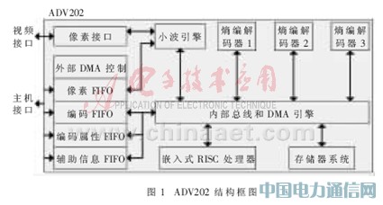 ADV202是AD公司的一款實現JPEG2000編解碼的芯片。圖1給出了ADV202結構框圖。該芯片主要由像素接口、小波變換引擎、熵編解碼器、嵌入式處理器、存儲器系統和內部DMA引擎等組成。ADV202內嵌了一個32位的RISC處理器,作為整個系統的控制者。這個RISC處理器具有自己的程序和數據存儲器所對應的ROM和RAM。ADV202集成了一個基于ADI專利的空間高效遞歸濾波小波技術(SURF技術)的小波核。可以支持高達6層分解的9/7和5/3小波變換。由于熵編碼的復雜度,ADV202提供了3個專用的硬件熵編碼器。ADV202的內部DMA引擎為內部存儲器之間、內部存儲器和各個功能模塊之間提供高速傳輸數據能力。ADV202的視頻接口支持CCIR656、SMPTE125M PAL/NTSC、SMPTE293M(525p)、ITU.R-BT1358(625p),或者任何最大輸入速率在非可逆模式下為65 MS/s、在可逆模式下為40 MS/s的視頻格式。ADV202有編碼和解碼兩種工作模式。在編碼模式下,視頻數據通過VDATA總線輸入ADV202,由小波核對輸入的數據進行小波變換,并把所有頻率子帶的小波系數存入ADV202內部的存儲器。每一個子帶根據ADV202編碼參數的設置進一步分成編碼子塊,然后由熵編碼器對編碼子塊執行內容建模和算術編碼,運算結果存入內部存儲器。隨后由內部DMA傳輸到CODE FIFO,通過HDATA總線把壓縮數據流從ADV202輸出。在解碼模式下,工作過程是編碼模式的逆過程。視頻接口(VDATA總線)支持單通道輸入YCrCb格式的8 bit、10 bit和12 bit數字視頻信號,還支持雙通道輸入Y和CrCb分離的16 bit、20 bit和24 bit數字視頻信號,但必須是4:2:2格式,這種視頻信號可以伴隨HVF(行場同步信號),也可以內嵌入EAV/SAV同步字節。主機接口(HDATA總線)提供有16 bit和32 bit初始化數據控制總線及8 bit、16 bit和32 bit數據輸出總線,支持多種輸出模式,包括正常主機模式、JDATA模式和DMA模式。其中JDATA模式是一種同步模式,8 bit輸出數據寬度。