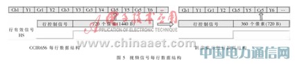 CCIR656格式視頻信號每行的數據結構如圖5所示[6-7],每行數據包括水平控制信號和亮度色差信號(Y,Cb,Cr)。CbYCr是指同址的亮度色差信號取樣,后面Y對應于下一個亮度取樣,比例是4:2:2。由于ADV202只接收4:2:2的YCbCr格式視頻信號,故采取圖5所示的跳像素方法,HS也做相應變化。
