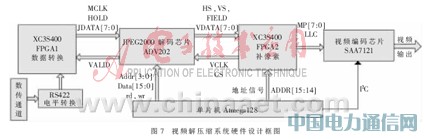 本文所述系統是某航空遙感系統的子系統,系統要求傳輸一路視頻信號,帶寬為0.48 Mb/s,視頻信號的采集、壓縮、下傳、回放的延時控制在200 ms以內。通常的視頻壓縮方法,如MPEG-X、H.26X是利用視頻圖像的幀間相關性進行壓縮,其解碼時間長,對實時性要求較高的系統不適合。而JPEG2000是把運動的視頻序列作為連續的靜止圖像來處理,對每一幀圖像單獨壓縮,圖像恢復實時性較好。本系統采用ADV202芯片實現JPEG2000壓縮。由于帶寬僅有0.48 Mb/s,在25幀/s正常視頻情況下壓縮率就會非常高。為了提高視頻還原質量,壓縮前利用FPGA實現跳像素和通過配置ADV202寄存器實現跳場減少數據量,降低壓縮率。解壓縮通過補場補像素,在顯示器上實時播放。
