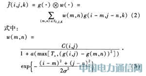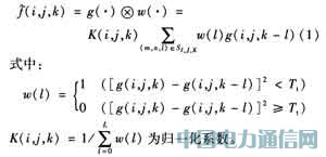 由式(2)和式(3)可見,本算法的空域自適應濾波為避免毀壞圖像各幀中的邊緣、紋理等細節,當前像素的濾波值只由濾波器范圍內彼此相近的像素決定,當某像素與當前像素差別較大時,其權值很小,因而對當前點的濾波值的影響也很小。同時,與當前像素空間位置越接近的點對當前像素的濾波值影響越大,這進一步減輕了空間濾波過程對圖像的空間細節的毀壞。