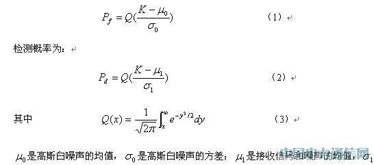 衡量能量檢測性能時,一般假設傳輸信道是高斯分布的,噪聲是零均值的高斯白噪聲。設接收信號通過帶寬為 的濾波器,檢測時間為 ,設門限為K,則虛警概率為: