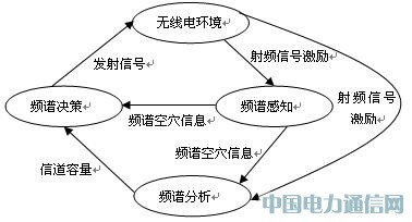 認知無線電的認知能力表現在能實時與它所處的環境交互,從而決定合適的通信參數并適應動態的無線環境。這個任務要求在公開頻譜中的自適應性操作,如圖1所示,稱之為認知循環。認知循環包含3個主要步驟:頻譜感知、頻譜分析和頻譜決策。