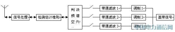 進行信號處理,從噪聲背景下發現信號和提取信號所攜帶的信息,并制定檢測估計準則,做出有無授權用戶存在(或頻譜空穴)的檢測報告,這就是認知無線電的頻譜感知過程,然后將頻譜空穴所在頻段劃分成若干信道,并把基帶信號調制到空隙頻段上,實際就是頻譜搬移,將相對較低的頻譜搬遷到較高的頻譜上,這樣信號就可以在這些高頻信道上進行傳輸了。