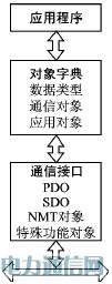一個CANopen設備模塊可分為3部分,如圖1所示。通信接口和協議軟件用于提供在總線上收發通信對象的服務;不同CANopen設備間的通信都是通過交換通信對象來完成的, 這一部分直接面向CAN控制器進行操作。對象字典描述了設備使用的所有數據類型、通信對象和應用對象;對象字典位于通信程序和應用程序之間,用于向應用程序提供接口。應用程序對對象字典進行操作,即可實現CANopen通信。它包括功能部分和通信部分,通信部分通過對對象字典進行操作實現CANopen通信;而功能部分則根據應用要求來實現。