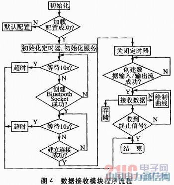 數(shù)據(jù)接收模塊主要實現(xiàn)多傳感器數(shù)據(jù)的接收、數(shù)據(jù)曲線的繪制和存儲。通過繼承Android平臺下的Service類,建立5個儀器可以同時后臺執(zhí)行的數(shù)據(jù)采集服務;配合Notification的便捷操作,實現(xiàn)不同儀器數(shù)據(jù)采集界面的切換。數(shù)據(jù)接收模塊程序流程如圖4所示。