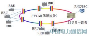 RRU到BBU采用不同的波長復用到同一光纖內(彩光原理),RRU和BBU采用彩光模塊,波長復用/解復用采用無源設備。目前的彩光光模塊可支持8種光波,每個光波即一個6G傳輸通道,相當于更多RRU到BBU之間的IQ的信號可在同一光纖上傳輸,從而提高光纖利用率,降低對城域網光纖資源的占用。支持環形拓撲、鏈形拓撲,不支持環帶鏈拓撲,光纖線路故障率低,適于2.5G低速CPRI業務。每個無源波分系統獨占一對纖芯,光纖纖芯需求量=2×RRU數量/RRU級聯級數/波長數(CWDM一般為8);當前RRU/BBU不具備性能劣化監測功能,部分具備線路故障定位能力。彩光模塊成本稍高,同時由于集成于無線設備,無線專業具備傳輸維護能力,擴容容易受限,界面不清晰,距離受限于光功率預算,專業協調和維護工作量都比傳統方式更大,一般不建議采用。適合光纖緊張地區的小規模C-RAN集中化部署。圖4示出的是彩光承載方式示意圖。