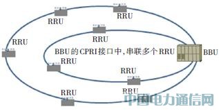 我們先看一下現有的基站傳輸組網情況。現有基站主要有一體化基站或分布式BBU+RRU兩種。分布式基站是把傳統基站的基帶處理部分(BBU)和射頻部分(RRU)分開的基站設備形態。BBU與RRU之間采用高速CPRI光接口,一般采用光纖直連的方式,如果采用遠供方式,傳輸距離在200 m以內。室分基站存在多個RRU級聯共享一個通用公共無線電接口(CPRI)的組網模式,目前典型級聯配置多是2~3級RRU級聯實現頻點覆蓋;雖然設備可以支持6級級聯,但由于可靠性、可維護性等限制因素,基本無應用。