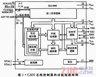 SJA1000是PHILIPS公司于1997年推出的一種獨立CAN總線控制器,用于汽車和一般環(huán)境中的控制器局域網(wǎng)絡(luò)。SJA1000主要由以下幾個部分構(gòu)成:接口管理邏輯、發(fā)送緩沖器、接收緩沖器、接收濾波器、位數(shù)據(jù)流處理器、位時序邏輯、錯誤管理邏。SJA1000是雙列直插式集成電路,功能框圖如圖1所示。
