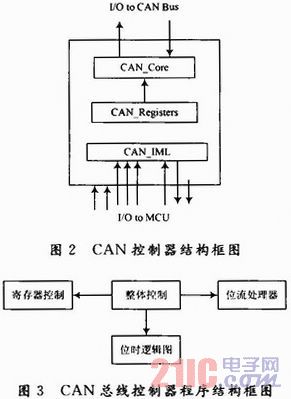 CAN_Core為CAN協(xié)議控制器的核心部分,完成CAN協(xié)議中的數(shù)據(jù)鏈路層的全部功能以及物理層的部分功能,包括LLC子層的接收濾波、超載通知和恢復(fù)管理、MAC子層的數(shù)據(jù)封裝/拆裝、幀編碼、媒體訪問管理、錯誤檢測、錯誤標定、應(yīng)答和串行化/解串行化、以及物理層的位編碼/解碼、位定時和同步。CAN_Registers為一寄存器組,外部微處理器可以通過地址直接訪問這些寄存器。根據(jù)功能框圖,設(shè)計了CAN總線控制器的程序結(jié)構(gòu),如圖3所示。