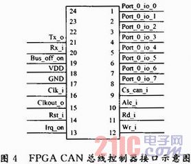 圖中Port_0_io_7到Port_0_io_0為地址/數(shù)據(jù)復(fù)合總線。Cs_can_i為片選輸入信號。當(dāng)Cs_can_i為0時允許訪問CAN總線控制器。Ale_i為1時,允許對寄存器進行賦值。Rd_i和Wr_i為微處理器的讀使能信號和寫使能信號。Irq_on為中斷輸出信號,用于中斷微處理器。Rst_i為復(fù)位輸入,用于復(fù)位CAN接口。Clkout_o為FPGA CAN控制器提供給微處理器的時鐘輸出信號,時鐘分頻寄存器可禁止該引腳輸出。Bus_off_on控制總線關(guān)閉和總線開放接口,Tx_o和Rx_i與收發(fā)器相連,向總線發(fā)送和接收數(shù)據(jù)。