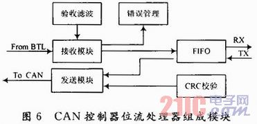 位流處理器是CAN總線控制器中控制數(shù)據(jù)流的發(fā)生器。它還執(zhí)行總線上的錯誤檢測、仲裁、填充和錯誤處理等功能。主要有接收模塊、發(fā)送模塊、錯誤管理模塊、CRC校驗、驗收濾波、FIFO等6個模塊組成,如圖6所示。其中CRC校驗、FIFO、驗收濾波在所執(zhí)行的項目中已經(jīng)有他人設(shè)計完成。