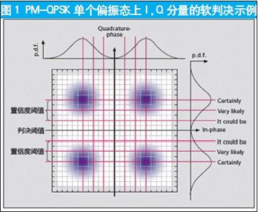 基于數字相干接收PM-QPSK調制100G接收機,不論其采用軟判決還是硬判決,其信號處理結構和流程基本相同,不同之處在于軟判決給后續的前向糾錯編碼(FEC)解碼單元提供了額外的可信度信息,而硬判決僅提供單比特判決信息,拋棄了可信度信息,放棄了模數轉換器和數字相干接收所提供的糾錯優勢。軟判決所提供的可信度信息可以進一步提高FEC編碼增益。