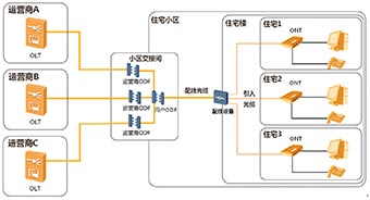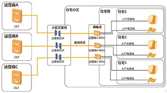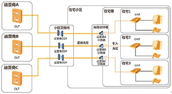 在這種模式下,不同的寬帶運營商分別建設小區外主干光纜及小區交接間內的運營商ODF設施,在用戶ODF上將某一用戶所對應的光纖跳接至不同運營商ODF上,即可實現用戶自由選擇運營商提供的接入業務。駐地網運營商負責用戶ODF至用戶家中ONT設備間的管線建設和維護。