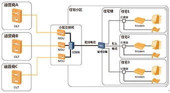 在這種模式下,各寬帶運營商分別在樓內弱電井/弱電間內部署接入設備(如圖4MDU設備),通過電纜跳接,實現用戶選擇不同運營商提供接入業務。駐地網運營商負責小區內通信管道和弱電井至用戶住宅內的通信線路的建設和維護。