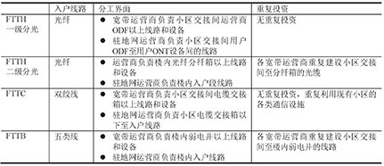 表1從入戶線路類型、分工界面和重復投資情況3個方面對上述4種建設模式進行了直觀的對比,從中可以看出這幾種模式各自所適用的場景。