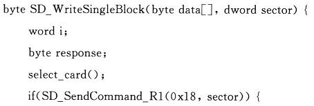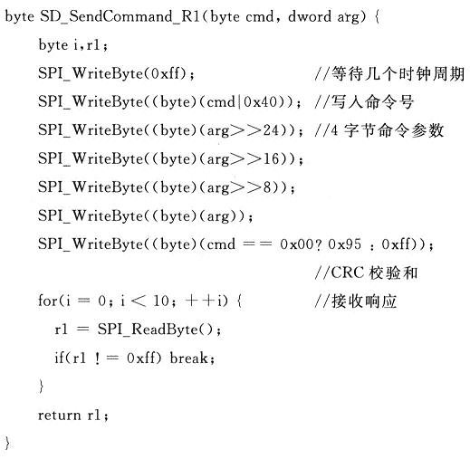 由于SD卡的命令具有統(tǒng)一的格式,因此可以用一個通用的寫命令函數(shù)來實現(xiàn)所有命令的發(fā)送。另外,考慮到多數(shù)命令的響應(yīng)類型都是R1,這里的通用寫命令函數(shù)所接收的響應(yīng)類型默認為R1。函數(shù)代碼如下: