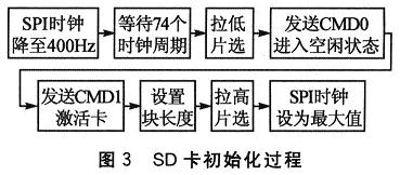 SD卡的初始化要遵循一定的步驟。首先將SPI時鐘降低到400 kHz,等待至少74個時鐘周期。接著拉低片選信號,并發(fā)送CMD0命令,對SD卡進行復(fù)位并使其進入SPI模式,這里需要正確的CRC校驗,校驗字節(jié)為 0x95。若SD卡進入空閑狀態(tài)(即接收響應(yīng)為0x01時),則發(fā)送CMD1命令,激活卡的初始化過程,此時響應(yīng)為0x00。然后設(shè)置塊的長度,一般為 512字節(jié)。最后將片選拉高并將SPI時鐘設(shè)為最大值,以保證最大的讀寫速度。SD卡初始化過程如圖3所示。