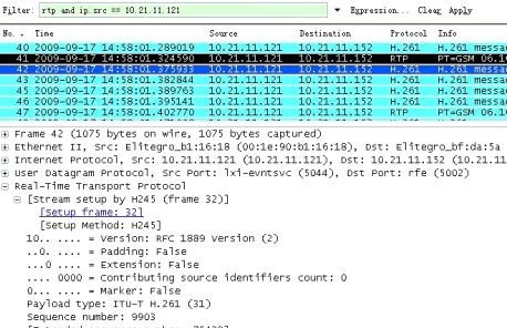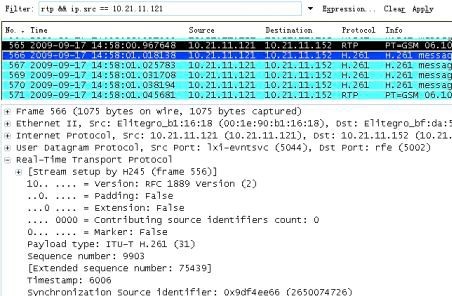 終端10.21.11.121 在正常網絡環境下,以512k的帶寬呼叫終端10.21.11.152,呼叫建立5 分鐘之后用Wireshark 抓到的音視頻數據包如圖4 和圖5 所示: