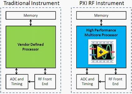 6.6GHz RF測試平臺非常適于自動化測試應用。使用高度并行的NI LabVIEW測量算法,PXI模塊化儀器可實現顯著優于傳統儀器的測量速度。若要了解PXI模塊化儀器為何能夠實現比傳統儀器更快的測量速度,從二者的架構區別中即可找到原因。雖然二者使用類似的組件,但是區別在于PXI系統使用高性能的多核中央處理器(Central processing units, CPU)。圖2中展示了兩種類型儀器的系統框圖,即可看出這一區別。