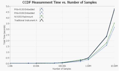 對于多數的WCDMA物理層測量來說,測量值的處理時間對整體的測量時間影響最大。對于這些測量來說,整體的測量時間通常與進行平均的次數有關。但也有一個例外,就是需要特別大的數據采集量的CCDF測量。在這種情況下,處理器的性能對于整體的測量時間影響較小。圖6所示即為CCDF測量,可以看到PXI測量系統比傳統儀器略快一些。