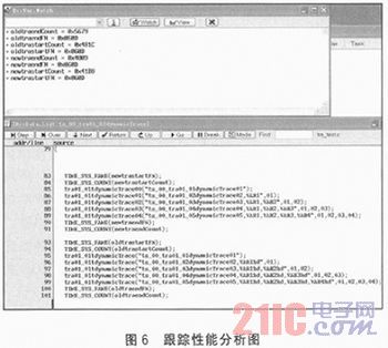 跟蹤性能分析圖如圖6所示,在原始跟蹤方案中調用5次跟蹤接口打印字符串”ts_00_tra01_01tdynamicTrace01”及相應個數的變量的值,跟蹤信息消耗的時間為T_old=(0x5679-0x481C)×(1/0x7800)=0.119 7 ms。在新跟蹤方案中,同樣調用5次新跟蹤方案,跟蹤接口打印同樣字符串的內容及相應個數的變量的值,跟蹤信息消耗的時間為T_new=(0x4809-0x4188)×(1/0x7800)=0.052 6 ms。由此可見,T_old的消耗時間大約是T_new的2倍,新跟蹤方案節省了一半以上的時間,然后又多次對各種跟蹤接口進行驗證、測試、對比后,再次確認了新跟蹤方案對ARM的執行效率有很大的提高。