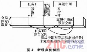 本設計方案采用的緩存機制是利用所有跟蹤函數在進入跟蹤時,均能夠確切知道當前跟蹤信息所需存儲空間長度的特點,為當前跟蹤信息預留出所需要的存儲空間。當低優先級任務的跟蹤信息被高優先級任務跟蹤信息搶占時,內存中已經為低優先級任務的跟蹤信息預留了存儲空間,不會導致跟蹤信息丟失和錯亂的情況,新緩存機制圖如圖4所示。