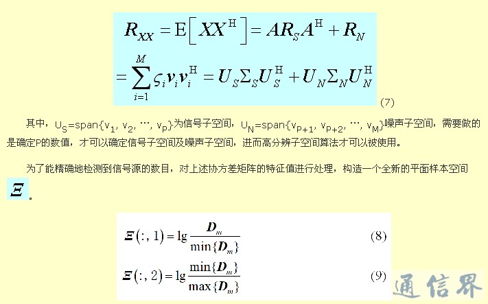對協方差矩陣RXX進行特征分解,分離出P個較大的特征值所對應的特征矢量構成信號子空間US,和其余M-P個特征值所對應的特征矢量構成噪聲空間UN[27]。