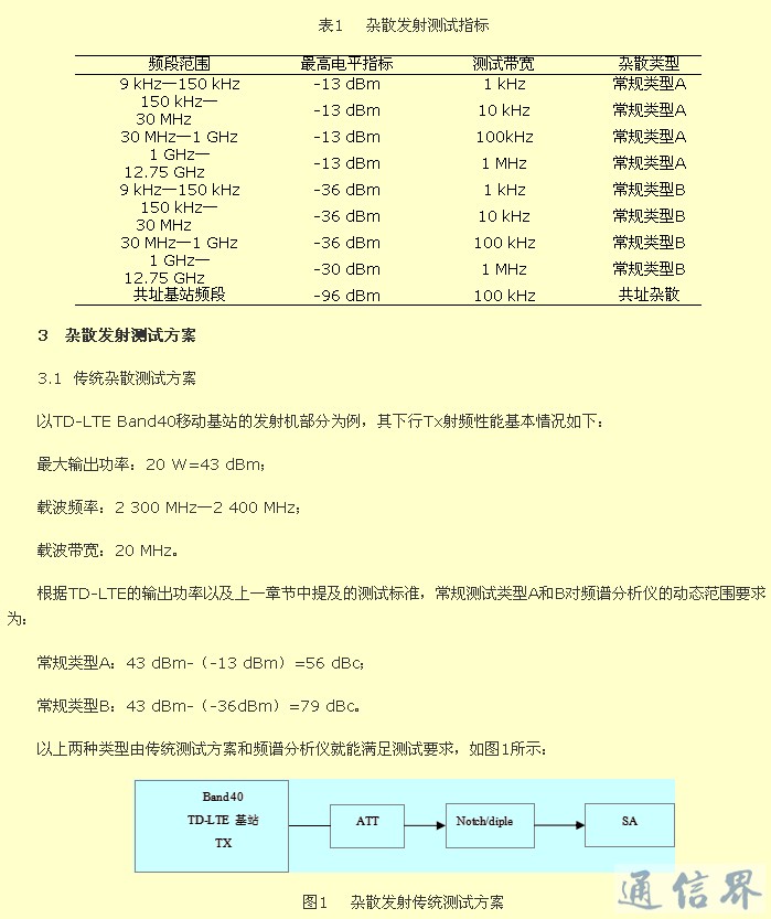當前TD-LTE基站的射頻測試已然具有完善的標準測試體系和指標。雜散發射作為移動基站射頻性能的重要測試項之一,一般情況下,其輻射指標為-36 dBm。而當LTE基站與其他GSM、WCDMA等基站共址時,其輻射指標要求很高,為-96 dBm甚至更低。本文根據3GPP射頻一致性測試協議36.141(LTE; Evolved Universal Terrestrial Radio Access (E-UTRA); Base Station (BS) conformance testing)章節6.6.4,以TD-LTE Band40為例,提出一種由雙工濾波器和低噪放相結合的測試方法,并在此基礎上實現了一種新型的共址雜散發射測試方案。