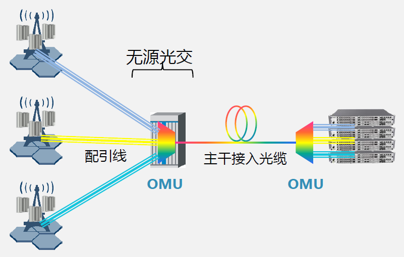 遠端部署無源WDM設備,無需供電,無需占用機房空間,部署位置可靈活選擇,支持機架式、抱桿和壁掛安裝,既可安裝于靠近AAU處解決單站業務,也可安裝于二級分纖點處匯聚多站匯聚業務。該應用模型是運營商前傳網建設面臨的比較典型的應用場景,可以有效解決光纜資源緊張問題,能快速的部署5G基站,并能實現匯聚機房周圍的快速布站,可以讓現有4G站與新增5G站共用一芯光纜資源。