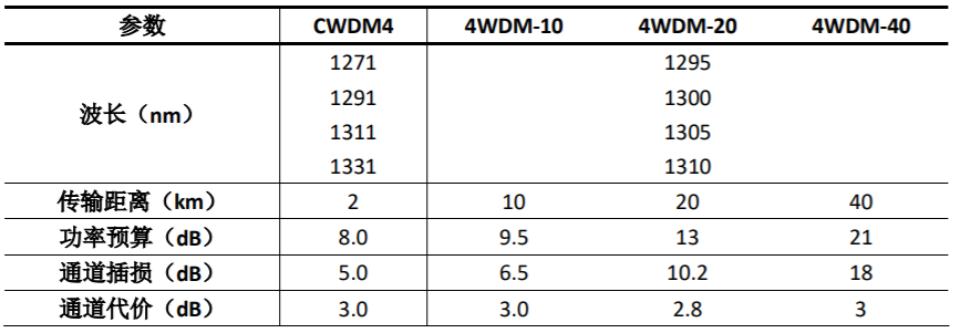 目前市場上各項性能指標如表1所示的CWDM(粗波分復用:Coarse Wavelength Division Multiplexing)[6]和LWDM(局域網波分復用:LAN Wavelength Division Multiplexing)[7]光模塊已經成熟并規模使用。