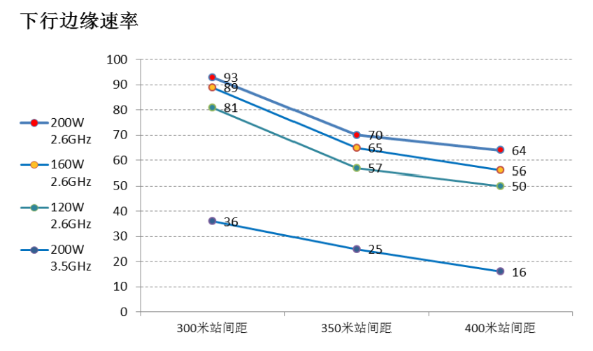 接著分析不同功率配置對覆蓋影響。如圖1所示,從試驗網測試數據結果可以看到,同等站距條件下,即使將5G功率降為120W,下行覆蓋性能依然優于功率滿配時3.5GHz的5G制式能力。