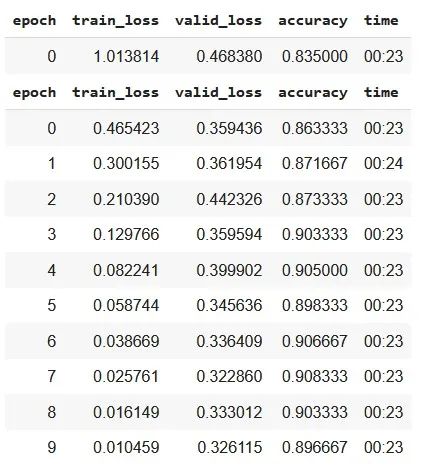 Fastai 提供了一個“fine_tune”函數,用于調整預訓練模型,以使用我們選擇的數據解決我們的特定問題。為了訓練模型,我們將 epoch 數設置為 10。