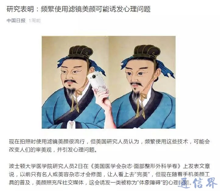 前幾天,看到一個報道:美國波士頓大學醫學院的研究人員8月2日在《美國醫學會雜志面部整形外科學卷》(JAMA Facial Plastic Surgery)上發表研究結果,指出由于修圖軟件與美顏相機的普及,人們覺得“完美”的長相不再是雜志上遙不可及的明星,而是修過圖的自己,讓越來越多人患上心理疾病“身體畸形恐懼癥”,甚至會拿自己修圖后的照片,作為整形的范本。