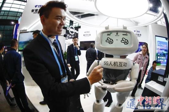 11月7日,在浙江烏鎮(zhèn)舉行的第五屆世界互聯(lián)網(wǎng)大會“互聯(lián)網(wǎng)之光”博覽會會場內(nèi),一臺5G人機互動機器人與工作人員玩起了“猜拳”的游戲,迅速的反應(yīng)讓參觀者吃驚。中新社記者 杜洋 攝