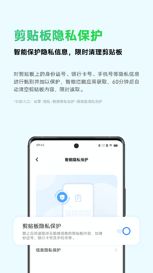 用戶使用剪貼板復制粘貼內容時,一般用完即走。剪貼板還提供限時清空功能,以60分鐘為單位,周期性對剪貼板上的內容進行清理。清空后,所有應用都將無法讀取其內容。保證用戶便捷體驗的同時,進一步提升了安全性。