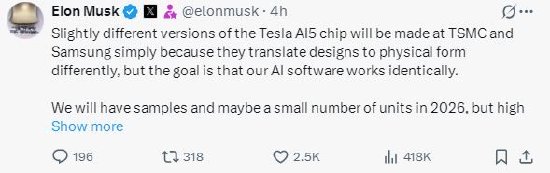 馬斯克寫道:“臺積電(294.05, -10.81, -3.55%)和三星將生產(chǎn)略有不同的特斯拉AI5芯片版本,因為它們將設(shè)計轉(zhuǎn)化為物理形式的方式不同,但目標(biāo)是我們的AI軟件同樣有效。